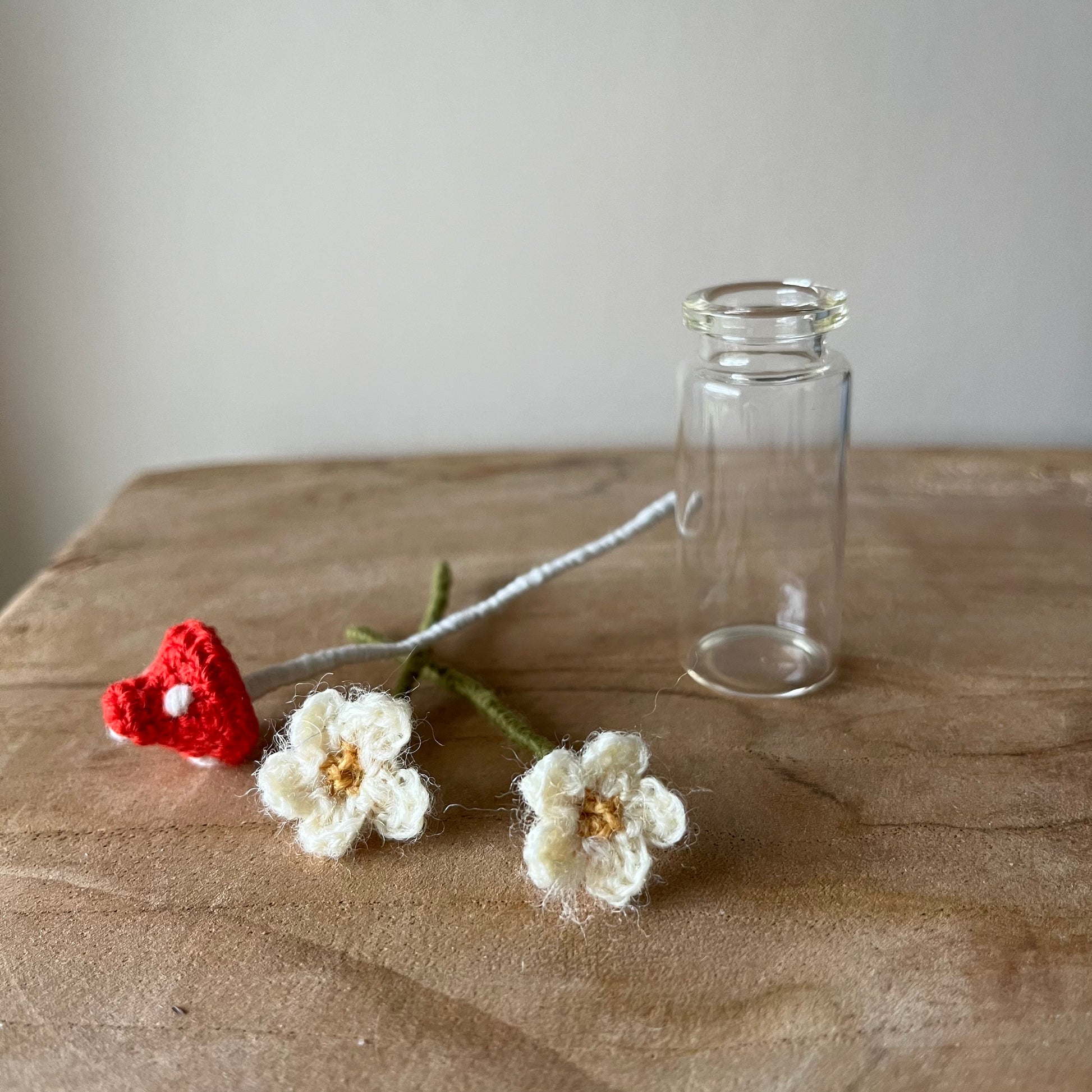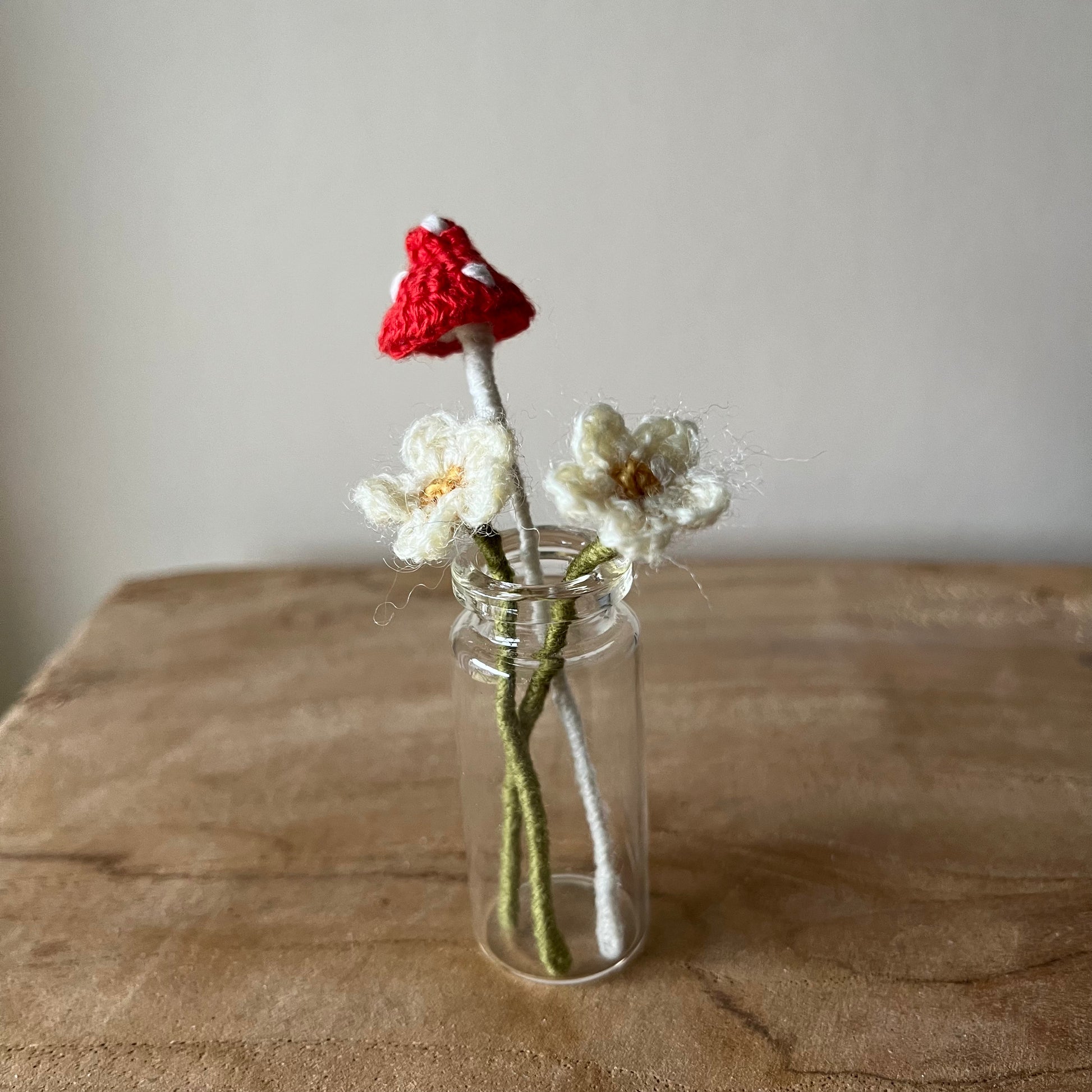 A selection of handmade micro crochet flowers in a glass vase.